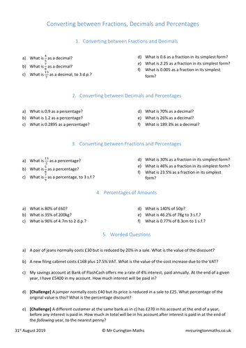 Contents Complete Lesson PowerPoints Tarsia Jigsaws and Card Sorts Lesson Activities Complete lessons from some of my. Fractions Decimals and Percentages Third Space Learning First name Last name Class Score 25 Instructions You may not use a calculator to answer any questions in this test.